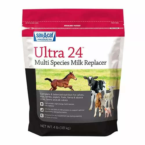 Ultra 24 Multi Species Milk Replacer is premium, complete and balanced nutrition for calves, kids, lambs, piglets, foals, llama & alpaca crias, fawns and elk calves. High protein, high energy multi-species milk replacer with 24% all-milk proteins and 24% fat to support optimal digestibility and performance. Can be used as a dry supplement or a replacement of mother's milk following colostrum feeding.