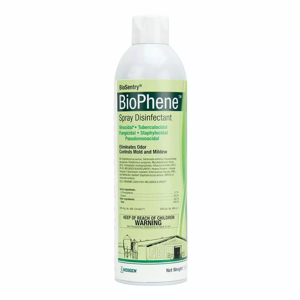 BioSentry®’s BioPhene™ Spray Disinfectant is an EPA registered disinfectant that effectively controls the common viruses and bacteria that challenge the agriculture market. In addition to controlling viruses, bacteria, and fungi; BioPhene Spray Disinfectant also eliminates odor and controls mold and mildew. BioPhene Spray Disinfectant can be used in vehicles, on footwear, or anywhere quick disinfection may be needed which makes it a great addition to your biosecurity portfolio.