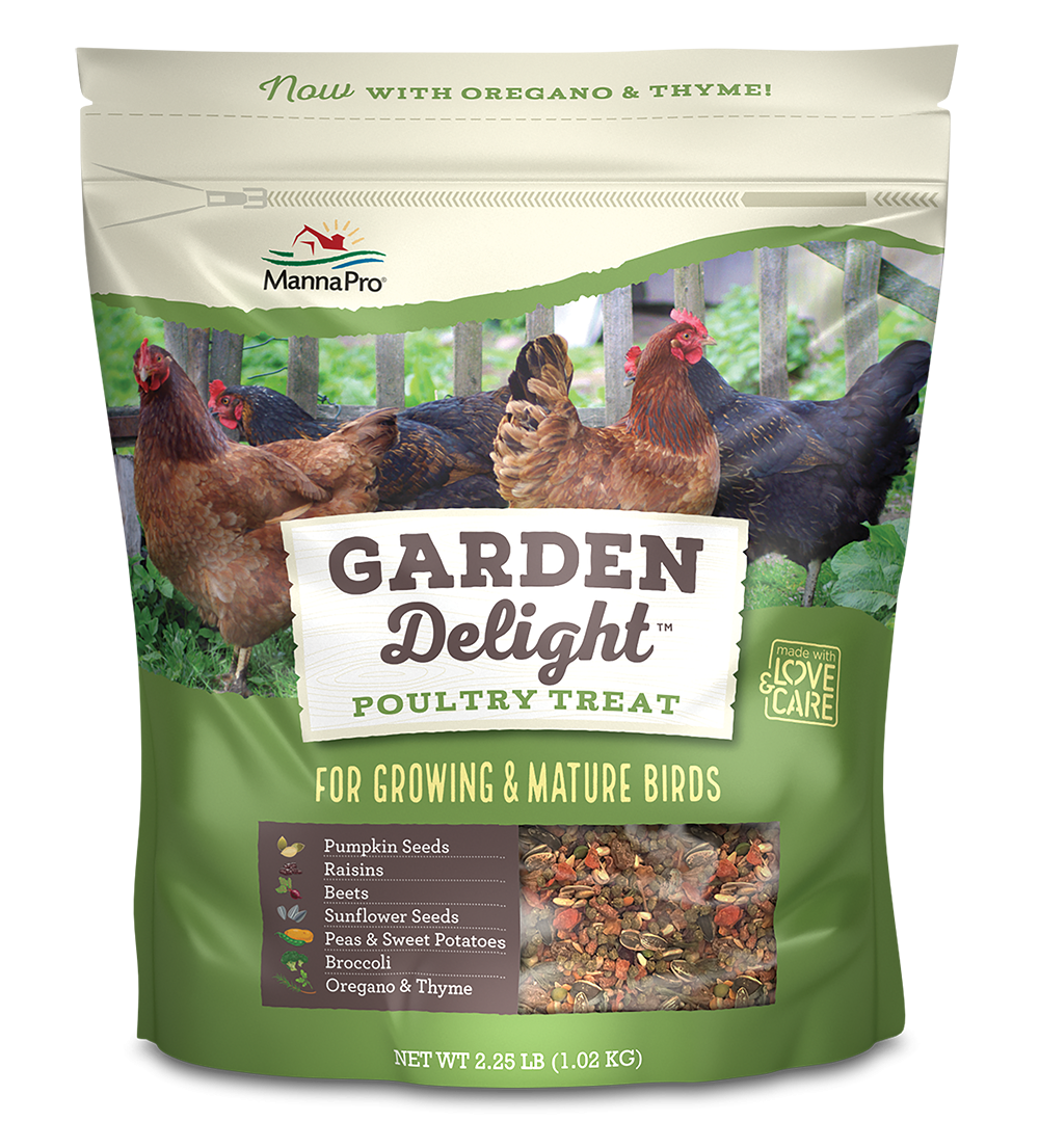 Manna Pro Garden Delight? Poultry Treat is a great way to reward your flock! With premium ingredients like pumpkin seeds, sunflower seeds, plus real fruits and vegetables, you can provide a treat year-round that contains all the goodness of a bountiful garden! Garden Delight also includes specially-formulated nutrition pellets for additional protein, vitamins and minerals.