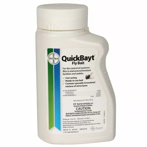 QuickBayt Fly Bait 350 G controls nuisance flies in or around horse stables and livestock facilities. It is a ready to use scatter bait, but also is easy to use in bait stations or as a paint-on. It will start killing nuisance flies in as little as 60 sec. QuickBayt Fly Bait red pellets contain two fly attractants to lure flies. It also contains Bitrex, a bitter substance to help prevent accidental ingestion by children and animals. This fly bait can be used indoors and outdoors. Ideal for horse stables, poultry houses, dairy barns, swine facilities and feedlots.