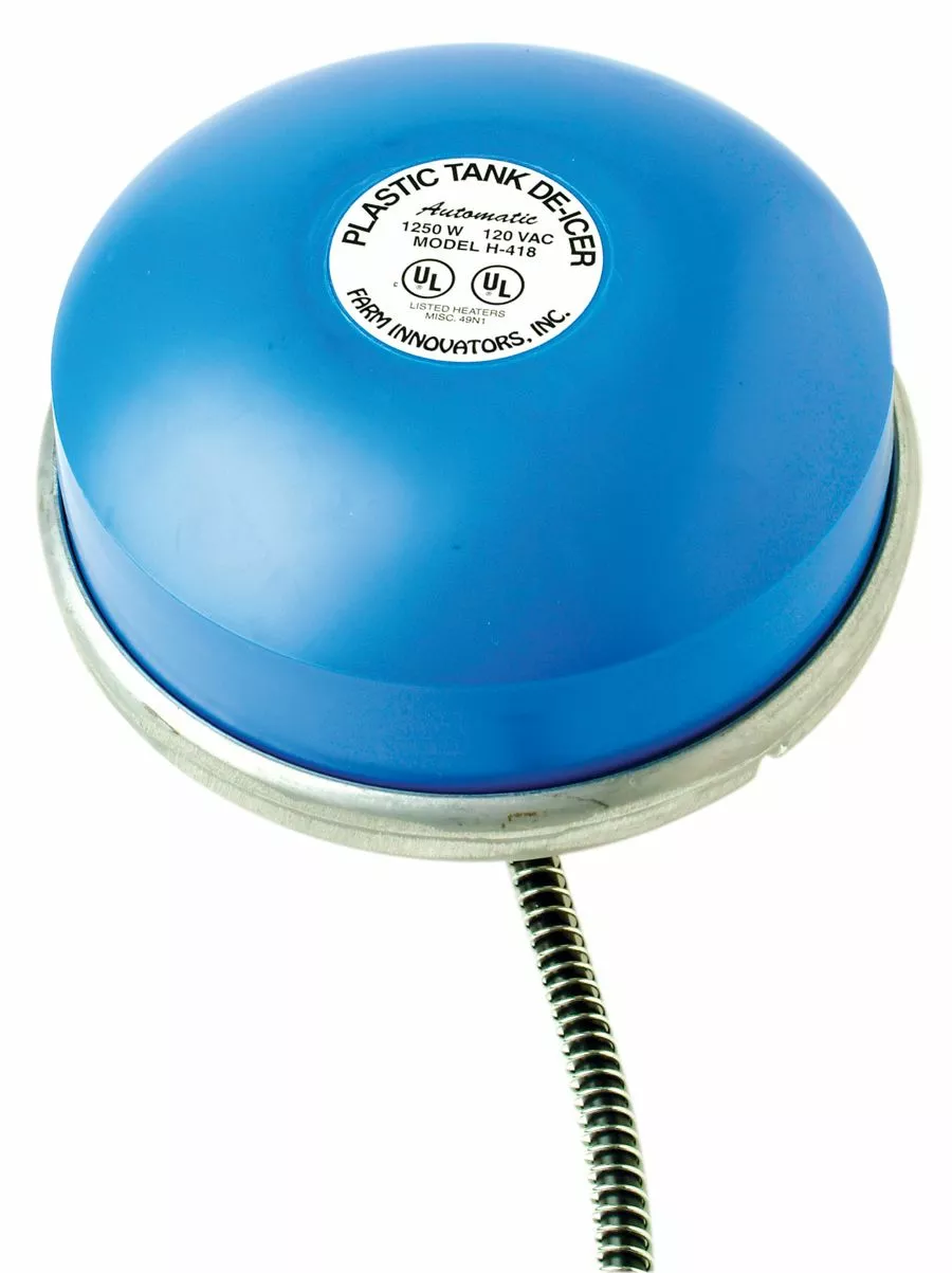 The Premium Farm Innovators Ice-Chaser Premium Cast Aluminum floating stock tank deicer for metal and plastic stock tanks. Safe to use in all tanks up to 300 gallons. Works as good or better than traditional 1500 watt floater, but with less wattage. Anti-chew metal cord protector. Cast aluminum design is more efficient and lasts longer.