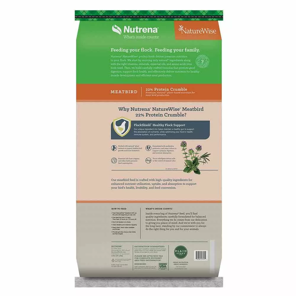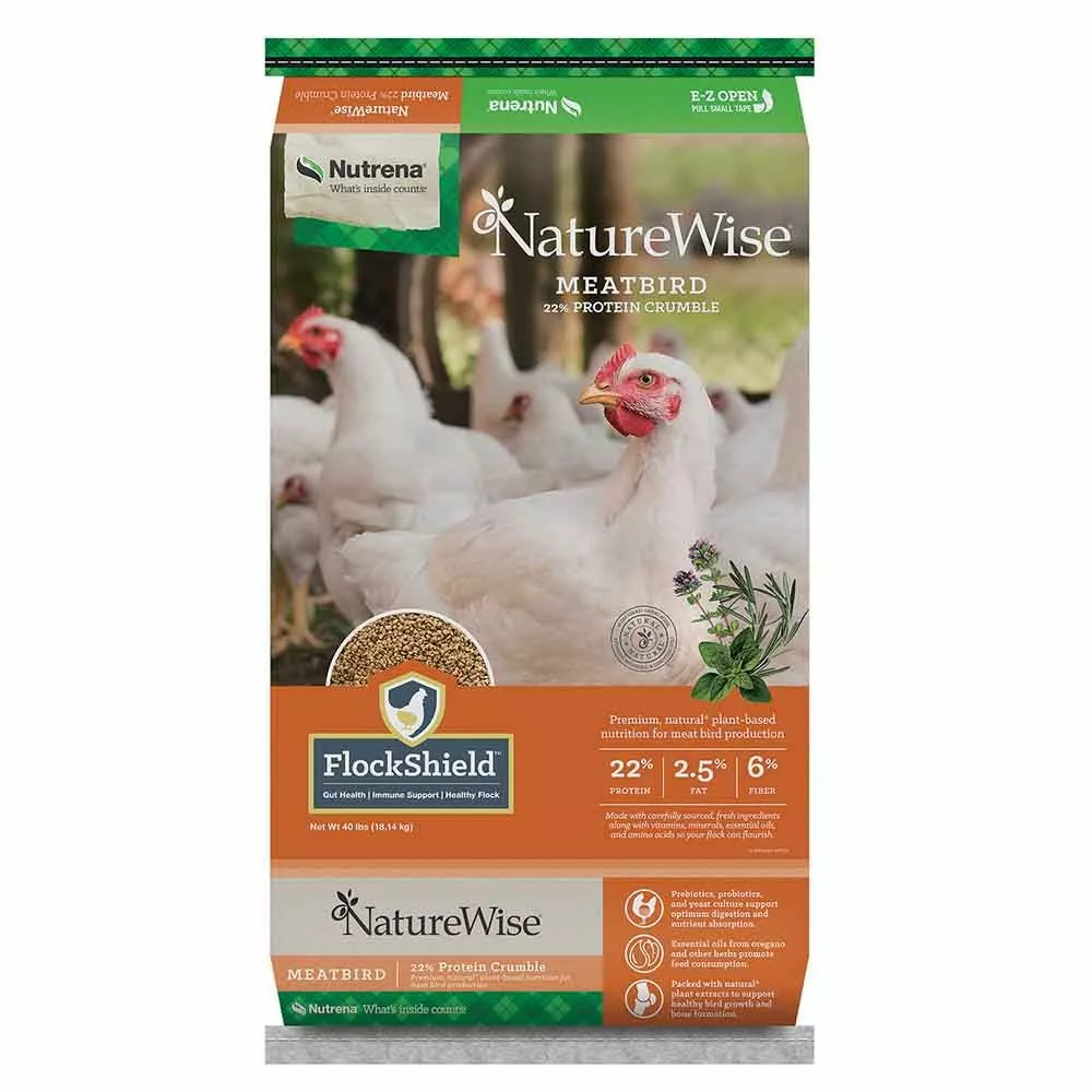 NatureWise 22% Meatbird Non Medicated is formulated with 22% protein and no added antibiotics or hormones to provide a natural, balanced nutrition for growth and muscle development in broilers, turkeys, ducks, geese and pheasants. There is added marigold extract to improve skin coloration, prebiotics, probiotics and yeast culture that support digestion. This feed is in a crumble form which encourages consumption.