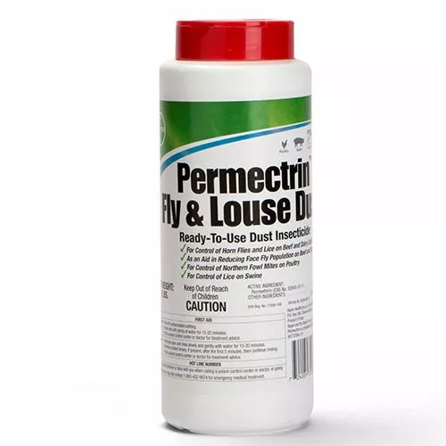 Permectrin® Fly & Louse Dust is for direct animal use on beef cattle, dairy cattle, swine and poultry. It is a ready-to-use dust designed to control horn flies and lice on cattle, lice on swine* and northern fowl mites on poultry. *Do not ship swine for slaughter within 5 days of last treatment.