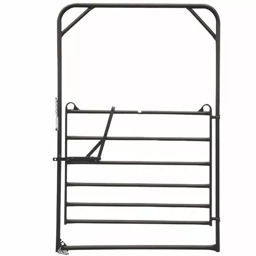 Priefert Utiltiy Bow Gate is a 9 ft. tall gate for easy ride through and is easy to open when on horse back. It connects to any other brand of panel with no special connectors or wire needed. IT is easier to etup on uneven ground. This gate will eliminate the need for special connectors at 3 or 4 way unions. There is a single piston lever latch and top and bottom chain connectors that offer increased versatility and safety.