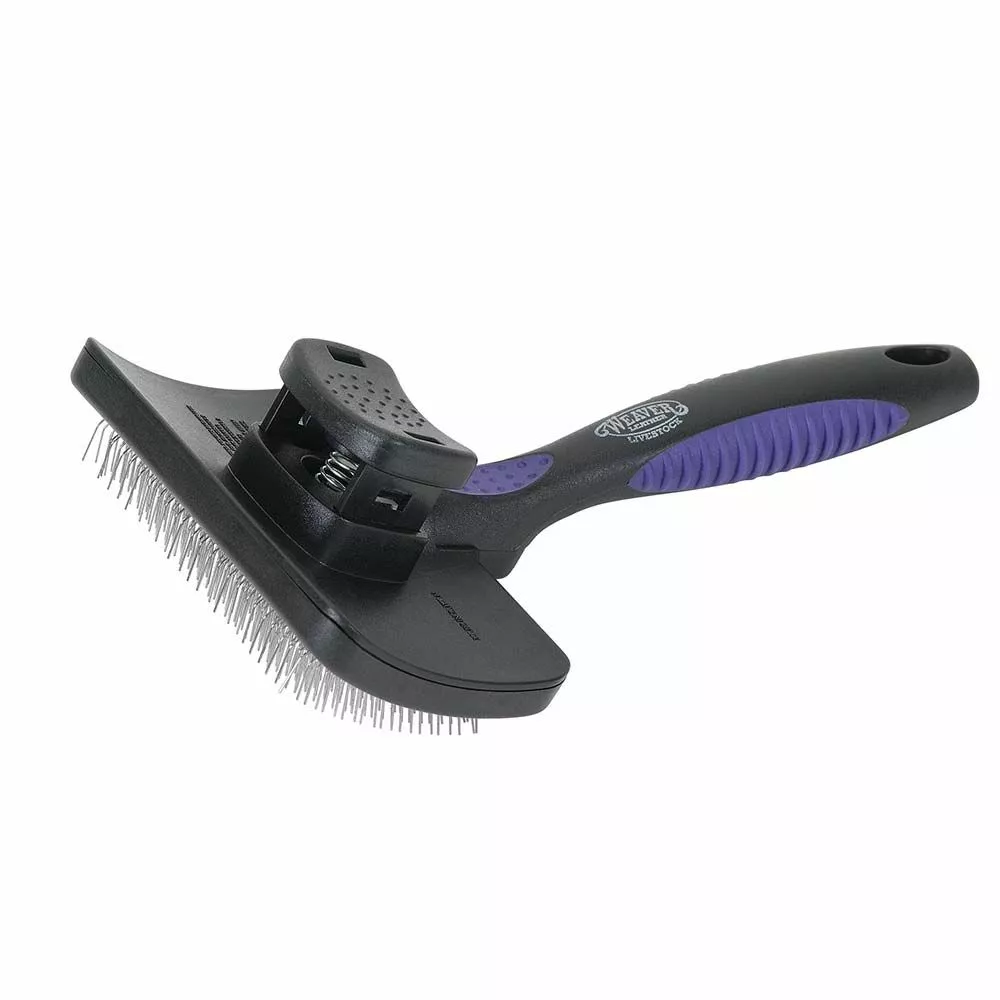 Weaver Leather Self-Cleaning Slicker Brush is great for fitting attle flanks, legs and tail heads. This 4 in. wide brush reaches deep to separate and untangle hair while building volume and smoothing out any lines. It also works great for lifting leg wool on lambs to add dimension and the appearance of bigger leg bone. Plus, any hair or leg wool is quickly removed from the brush with a push of a button. Small stainless steel teeth. No-slip grip for safe handling.