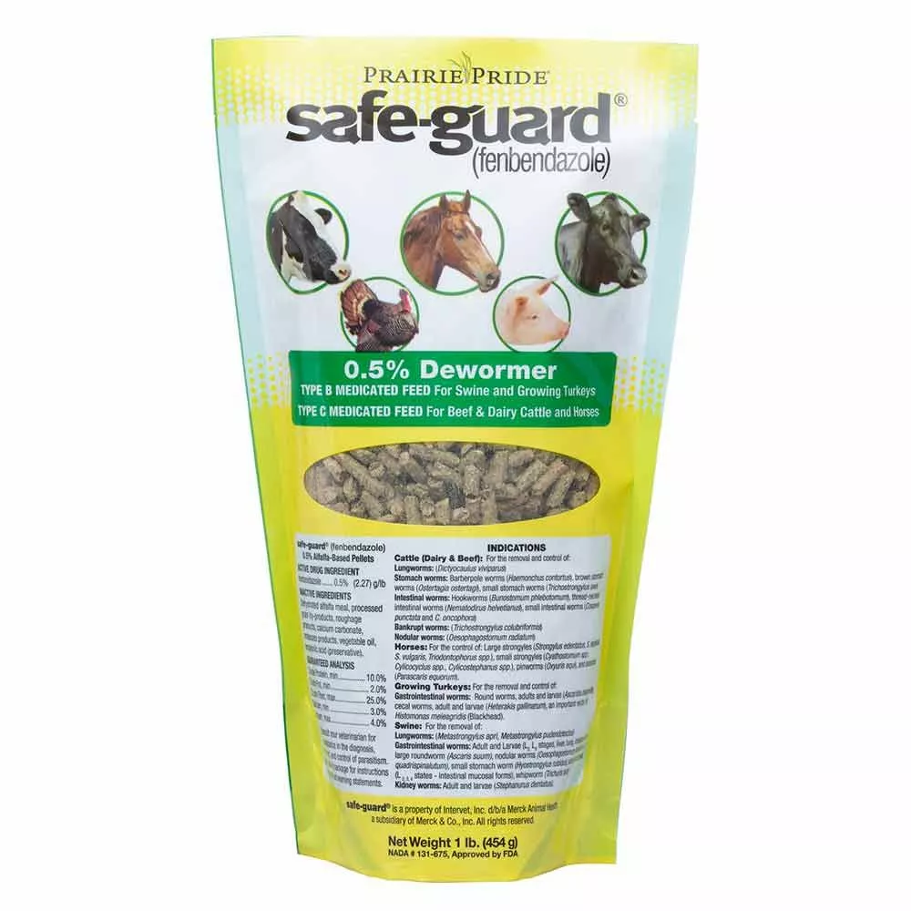 Safe-Guard® 0.5% Dewormer Medicated is a wormer that is approved for beef, dairy cattle, swine, horses, and for wildlife and zoo ruminants. It is a palatable alfalfa-based pellet. Safe-Guard® is a very safe and effective wormer that also has a wide spectrum of activity. Parasites are very detrimental to the animal. They depress appetite, lower dry matter intake and challenge the immune system, resulting in reduced production.