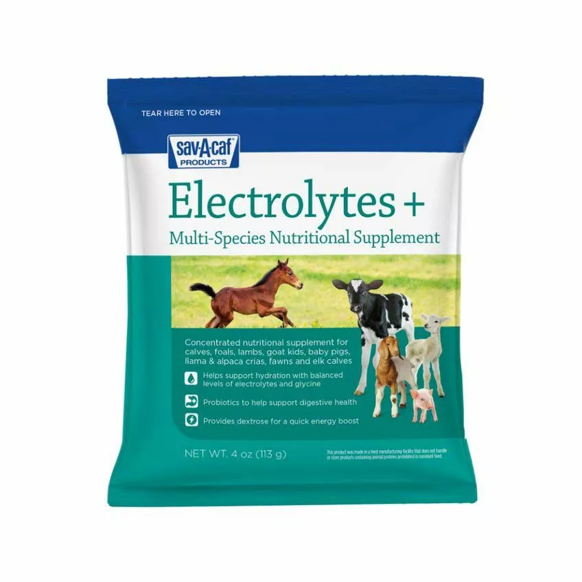 Sav-A-Caf Electrolytes Plus is a concentrated, high energy supplement for animals that are scouring or stressed, from hot or cold weather, extra handling or transport. It contains sodium bicarbonate for proper pH, the amino acid glycine to support rapid absorption, kaolin to absorb toxins and probiotics for digestive health. It is great for calves, horses and foals, goats and kids, sheep and lambs, pigs, fawns, elk calves, llamas, alpaca and crias, dogs and puppies, cats and kittens. It has a pleasant vanilla aroma.