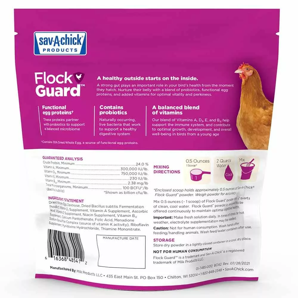 SAV-A-CHICK Flock Guard is a daily supplement to help maintain optimal gut health in chickens, ducks, turkeys, geese, pheasants, and quail of all life stages.