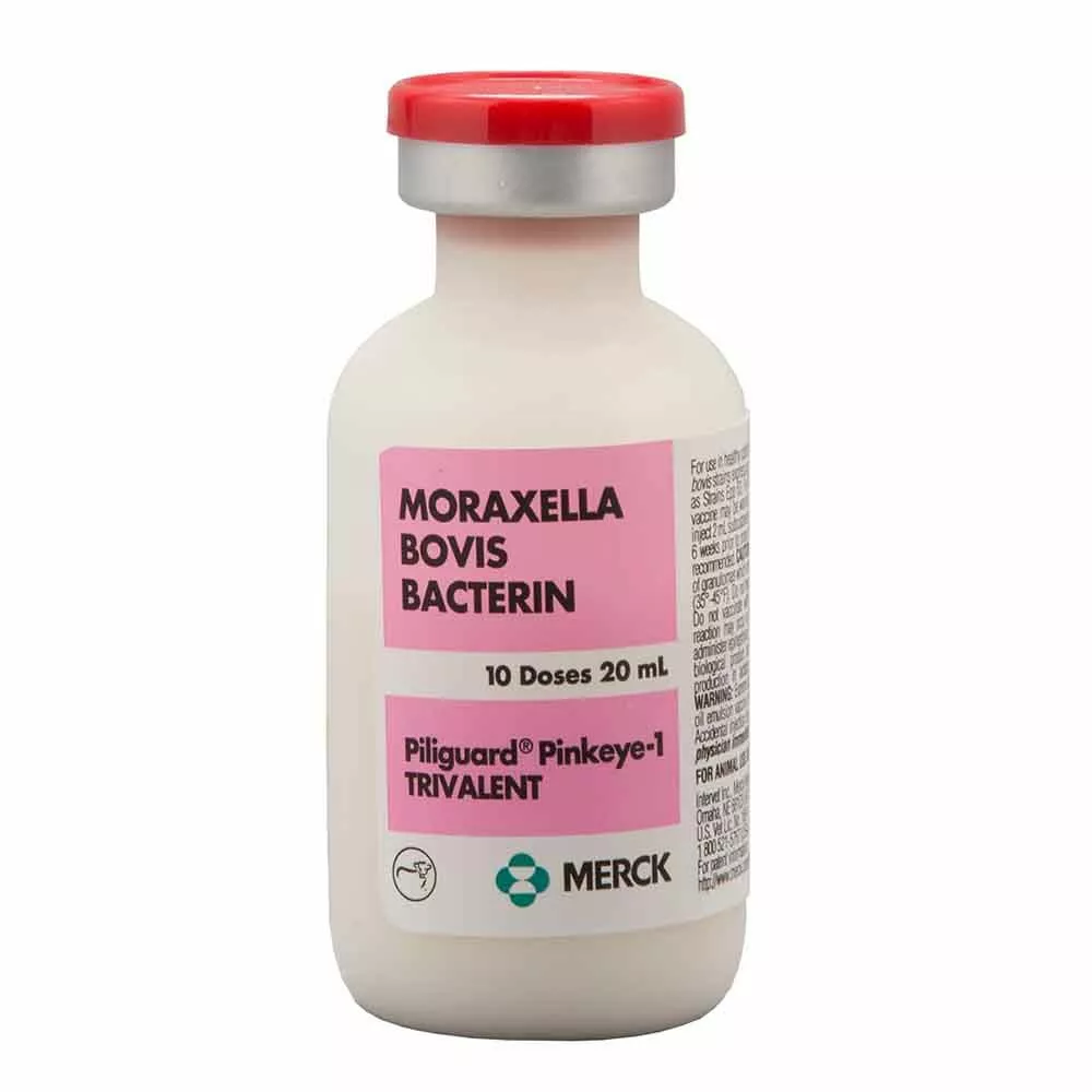 Merck PILIGUARD® Pinkeye-1 Trivalent is for use in healthy cattle to aid in the control of pinkeye associated with infection by Moraxella bovis. Use 3 to 6 weeks prior to onset of pinkeye season. An annual revaccination is recommended. Do not vaccinate within 60 days of slaughter. Transient local reaction may occur at the injection site. If anaphylaxis occurs administer epinephrine. Hypersensitivity reactions may occur with a biological product and can cause temporary reduced milk production in lactating cattle.