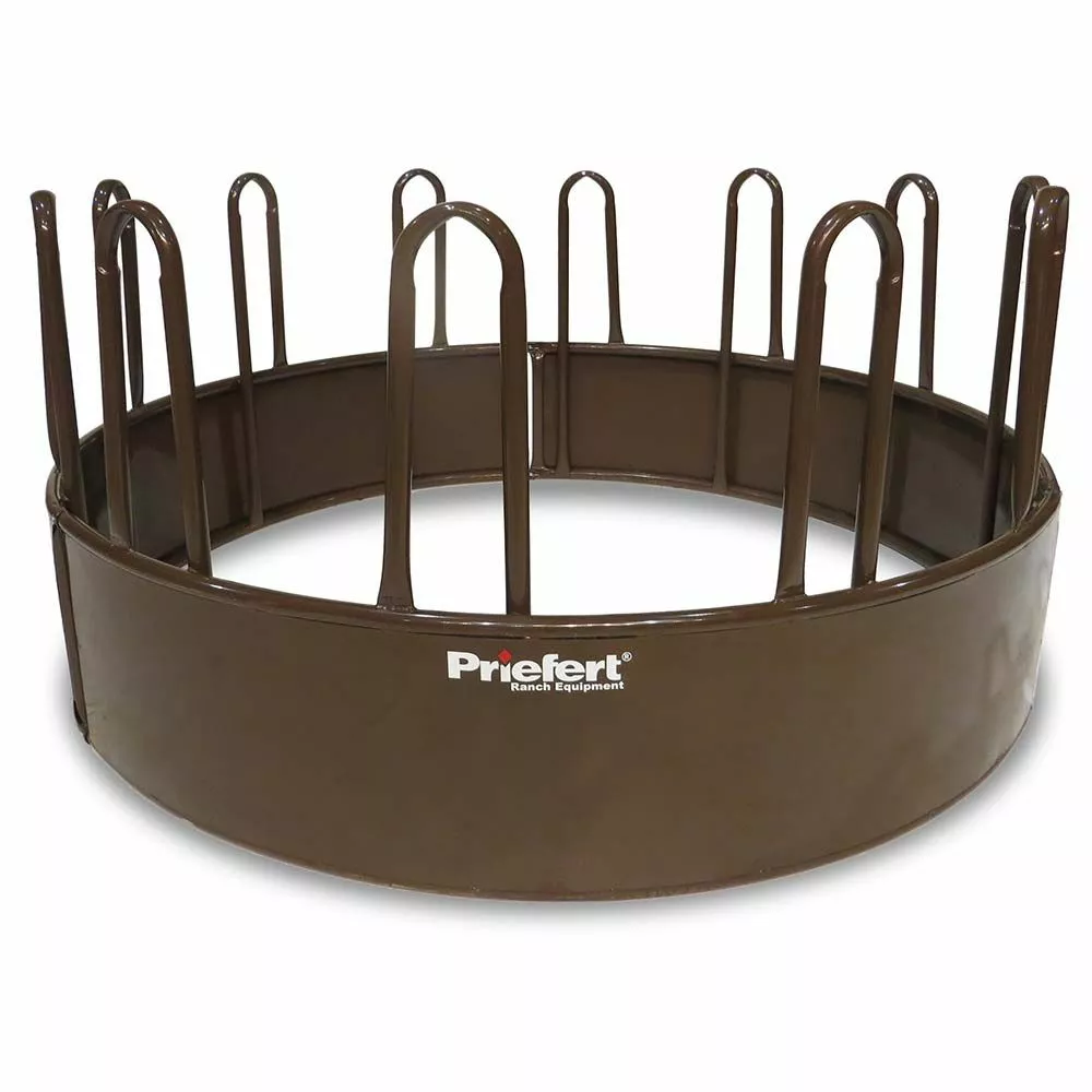 Priefert Round Bale Horse Feeder features traditional Tombstone design, that prevent horses from rubbing their manes off as they do when feeding out of conventional, horizontal and slant bar round bale feeders. Tombstone loops are made of 1.66'' O.D 16 gauge tubing. Sheeted bottom 17''solid, 7'' legs. Upper loops 25'' over sheeted bottom. Priefert quality and durability make this popular design horse feeder a great choice for feeding round bales to multiple horses. Color may vary by location.