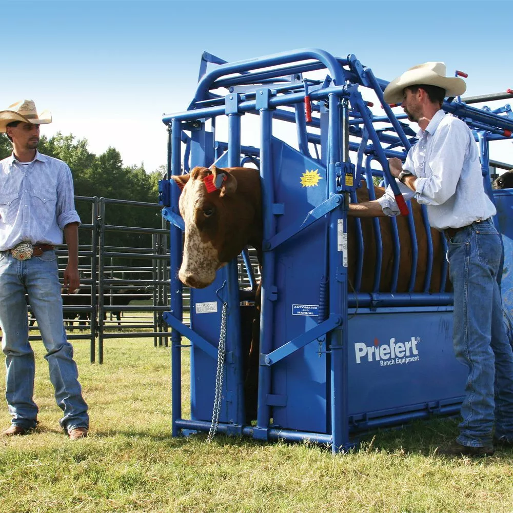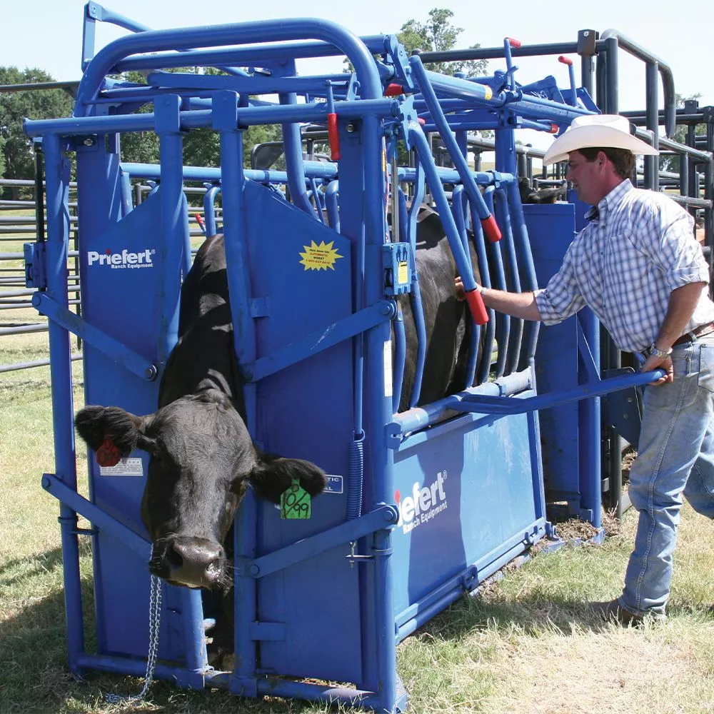 Priefert Ranch Equipment Squeeze Chute. The 'calf only' entry selection is available on every chute by simply pulling a pin located on top of the tailgate. The Floating floor width adjustment allows floor to be adjusted in seconds with the pull of an overhead lever. No digging through mud and manure required. This chute comes standard with an Automatic/Manual Head gate (HG91). It is dip Painted in Priefert Blue. It comes with five contoured upper side panels on each side of the chute with gravity latches. The head gate locks and Side Squeeze locks are GUARANTEED FOR LIFE! Maximum neck access allows greater convenience for preferred injection sites. An overhead squeeze lever pulls down parallel to the chute so it is not in the operator's way while working cattle. The removable bottom access panel on both sides of the chute. There is split tailgate with dual controls. The squeeze function uses infinite locking system technology; allows a perfect fit for every size animal. Standard side exit for sorting or emergency use with an easy pull lever return handle. All measurements are inside dimensions. Lubricate locks and all moving parts with WD-40 before each use. Optional wishbone carriage and carriage receiver (required for transport) are sold separately.